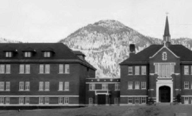 * Veduta esterna della Kamloops Indian Residential School in una foto [ritagliata] del 1930 di autore ignoto tratta da wikimedia commons, immagine originale e licenza