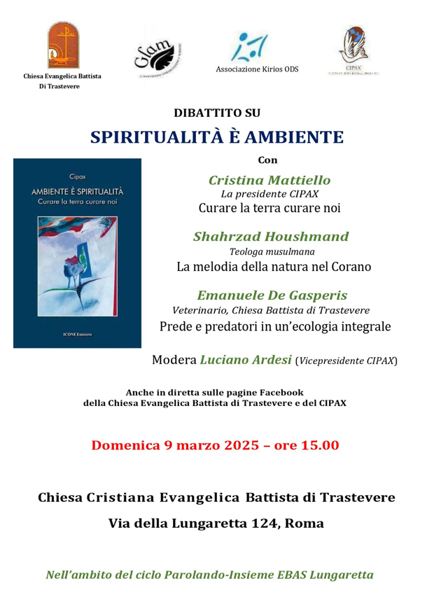 Il 9 marzo, alle ore 15, presso la chiesa cristiana evangelica battista di Trastevere a Roma in via della Lungaretta 124 (e anche online), dibattito su "Spiritualità e Ambiente". Vedi dettagli in locandina.