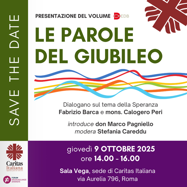 ROMA – Il 9 ottobre, ore 14-16, presso la Sala Vega della Caritas Italiana (via Aurelia 796), incontro dal titolo “Le parole del Giubileo. Comunicare la speranza”. Durante l’evento, presentazione del volume “Le parole del Giubileo” (EDB), realizzato da Caritas Italiana insieme al Forum Disuguaglianze e Diversità (ForumDD). Intervengono don Marco Pagniello (direttore di Caritas Italiana), Fabrizio Barca (co-coordinatore del ForumDD), mons. Calogero Peri (vescovo di Caltagirone e membro di Presidenza di Caritas Italiana). Modera Stefania Careddu (giornalista). «Al centro dell’evento – si legge in una nota di invito dei promotori – il tema della Speranza, vista in una prospettiva laica e in una prospettiva cristiana. Il volume, che rappresenta l’avvio della nuova collana EDB “Abitare il cambiamento”, pensata e realizzata con Caritas Italiana, propone un percorso di riflessione per l’anno giubilare in corso che prende spunto dai segni di speranza indicati nella Bolla di indizione del Giubileo 2025 per approfondire alcune delle sfide cruciali del nostro tempo: povertà, immigrazione, salute, pace, giovani, povertà educativa e carcere».