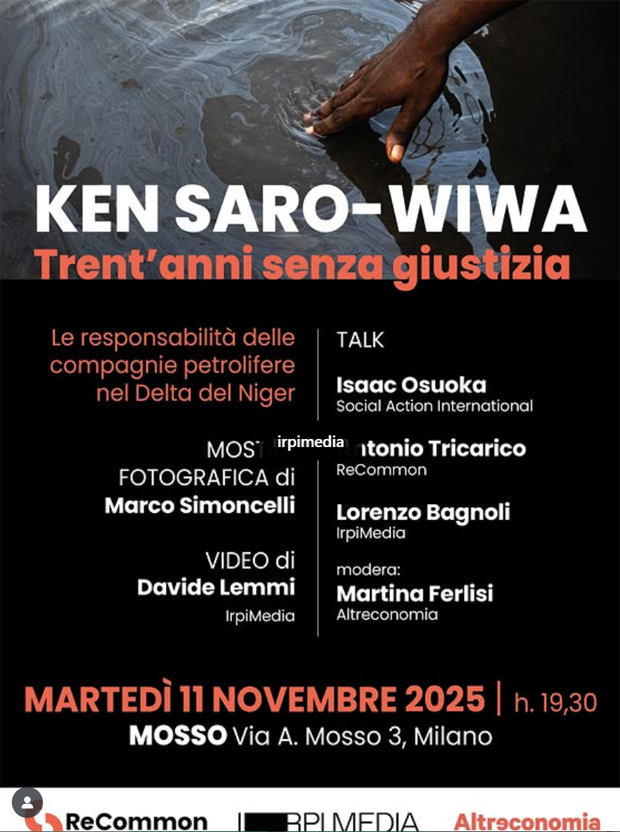 A 30 anni dall'uccisione di Ken Saro-Wiwa, ReCommon, IrpiMedia e Altreconomia, insieme ad attivisti ogoni, promuovono una serata per «mettere a fuoco le enormi responsabilità dei colossi dell'oil & gas nel Delta del Niger, tra le zone più inquinate al mondo».