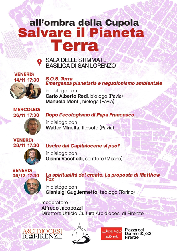 FIRENZE - “Salvare il pianeta Terra” è il titolo della seconda rassegna “All’ombra della Cupola”, promossa dall’Ufficio Cultura dell’Arcidiocesi di Firenze e dalla Libreria san Paolo di Firenze. «A dieci anni dall’Enciclica di papa Francesco Laudato si' - si legge nell'invito dell'arcidiocesi - si tratta di mettere a fuoco alcuni temi chiave indicati nel testo per renderli operativi e vitali nella quotidianità delle nostre esistenze, ancora troppo distratte sui temi ecologici. La rassegna chiama a raccolta discipline diverse (biologia, filosofia, arte, teologia) per intrecciare sguardi e sensibilità nuovi, individuare percorsi inediti ed operare un salto di coscienza collettivo. Gli incontri si svolgono presso la Cappella delle stimmate nel chiostro della Basilica di San Lorenzo».
