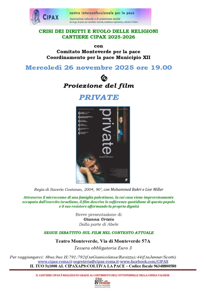 ROMA-ADISTA. Mercoledì 26 novembre 2025, alle ore 19, presso il Teatro Monteverde (via di Monteverde, 57A), incontro del Cantiere CIPAX 2025-2026 “Crisi dei diritti e ruolo delle religioni”. Promuove il CIPAX, con il “Comitato Monteverde per la Pace” e il “Coordinamento per la pace Municipio XII”. Durante l’incontro, proiezione del lungometraggio “Private”, film drammatico del 2004 diretto da Saverio Costanzo. Attraverso il microcosmo di una famiglia palestinese, la cui casa viene improvvisamente occupata dall'esercito israeliano, il film descrive le sofferenze quotidiane di questo popolo e il suo resistere affermando la propria dignità.