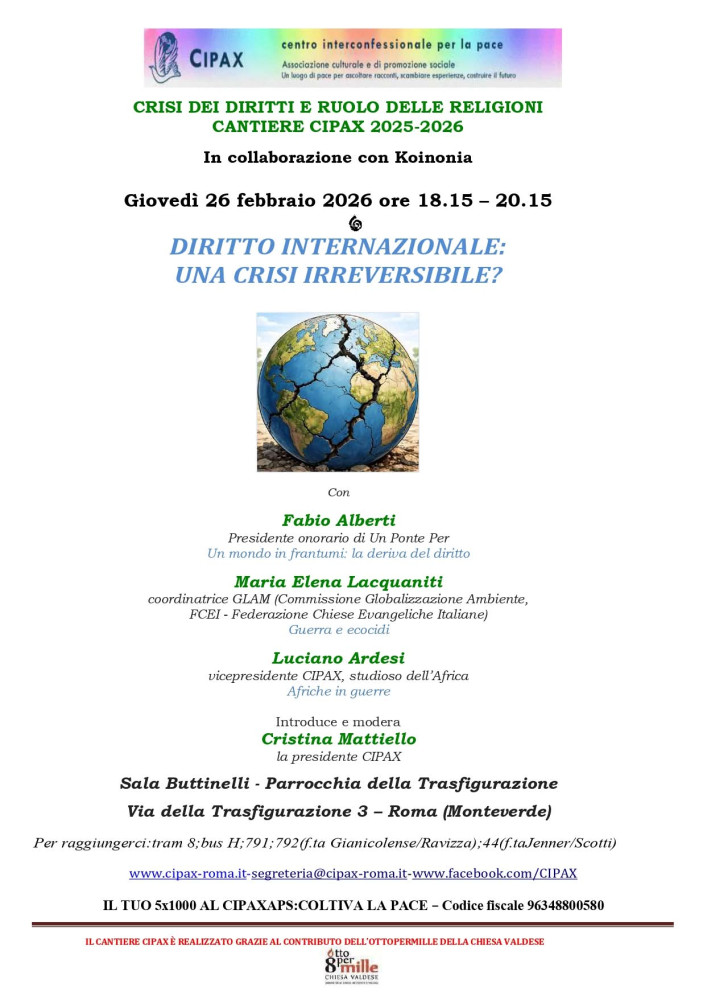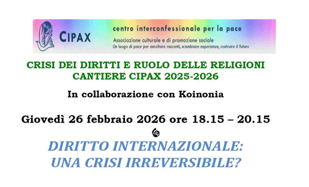 Il 26 febbraio, ore 18.15-20.15, a Roma presso la Sala Buttinelli della Parrocchia della Trasfigurazione (via della Trasfigurazione, 3), nell'ambito del Cantiere CIPAX 2025-2026, incontro sul tema: "Diritto internazionale: una crisi irreversibile?".