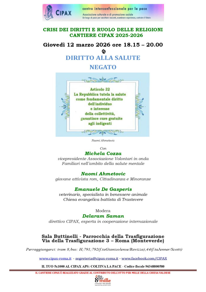 ROMA - Il CIPAX (Centro Interconfessionale per la Pace) invita a partecipare all'incontro "Diritto alla salute negato, che si terrà nell'ambito del Cantiere 2025-2026 "Crisi dei diritti e ruolo delle religioni" realizzato grazie al contributo dell’Otto per Mille della Chiesa Valdese, giovedì 12 marzo 2026, ore 18.15-20.00, presso la "Sala Buttinelli" della Parrocchia della Trasfigurazione (via della Trasfigurazione 3, zona Monteverde).